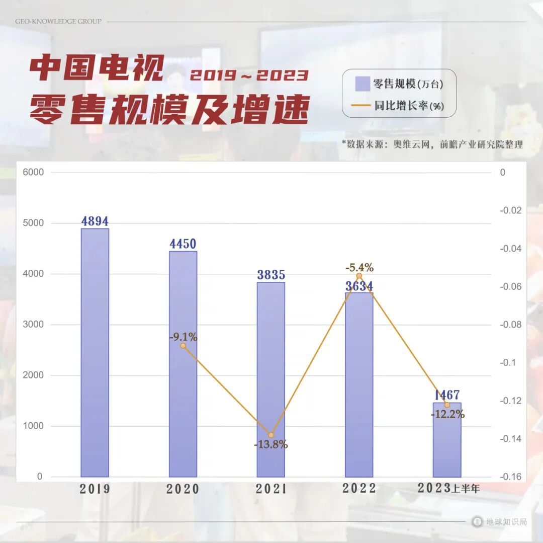 伴随着电视开机率暴跌的,是中国近年来电视销量的一路走低。2019年中国电视销量尚有近5000万台,到了2023年上半年就剩下不到1500万台了。